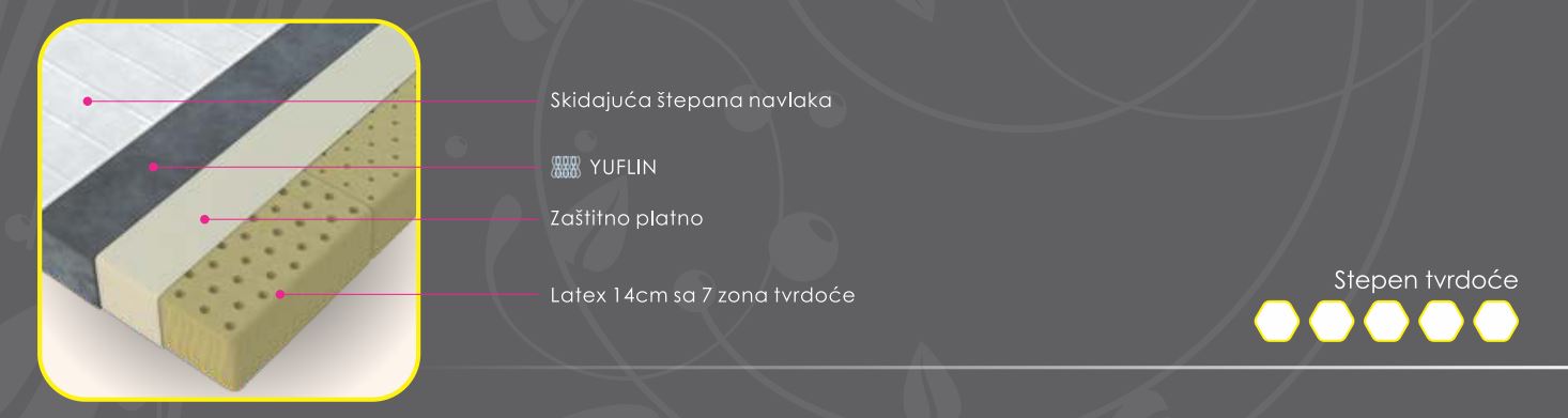 Ukoliko više volite čvršće dušeke onda je Latex pravo rešenje za vas, jer se prilagođava telu ali ipak nemate utisak da “tonete” u njega kao što je slučaj sa memorijskom penom. Ovo je model koji omogućava ubrazanu relaksaciju I opustanje nakon dugih I napornih dana.