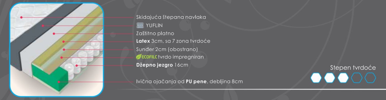 Sky Latex je pouzdan i udoban dušek koji izizetno podupire telo pri spavanju i sprečava krivljenje kičme.Kvalitetna 7-zonska latex pena osigurava udobno ležanje te miran,opuštajući i zdrav san. SkyLatex je dušek koji je specijalno dizajniran za ljude koji preferiraju čvršću podlogu za spavanje.