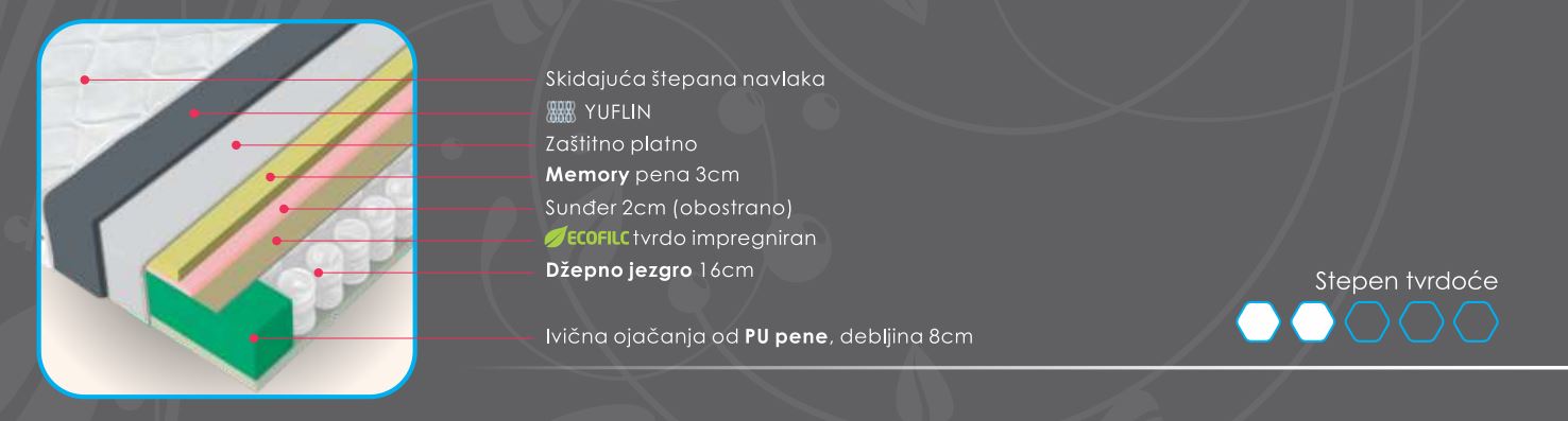 Dušek Sky Memory veoma nežno reaguje na temperaturu tela i pokrete pri spavanju,redukuje pritisak na telo čime je olasšana cirkulacija,a u telu se javlja ugodan osećaj opuštanja pritiska. Sky Memory dušek Vam omogućava dublji i kvalitetniji san i smanjuje verovatnoću buđenja tokom noći.